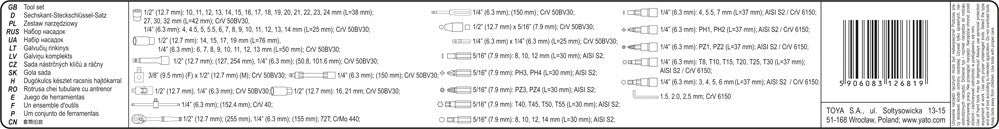 Įrankių rinkinys | 6.3 mm (1/4") + 12.5 mm (1/2") | 94 vnt. (YT-12681) yra užsakomoji prekė, ją išsiųsime per 3-4 savaites.