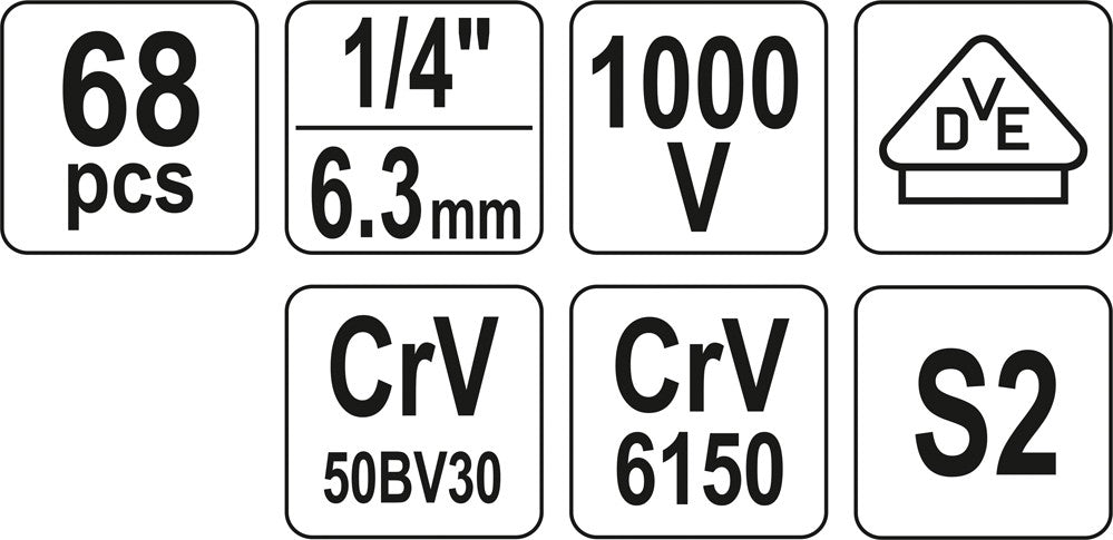 YATO YT-39009 PRO klasės izoliuotų įrankių elektrikams rinkinį sudaro 68 įrankiai ir jų dalys, išdėstyti patogiame plastikiniame lagamine. Įrankiai preciziškai sukalibruoti, pagaminti iš tvirto chromo vanadžio plieno (CrV50BV30 | CrV6150 | AISI S2 | SK2), tinka itin didelio intensyvumo naudojimui. Komplekte yra 1/4" šešiakampių HEX galvučių rinkinys, reguliuojamas veržliaraktis, lituoklis, skaitmeninis multimetras, antgalių rinkinys, LED prožektorius ir daugybė kitų elementų. Įrankiams su izoliuotomis 1000V rankenomis išduotas VDE (Verband der Elektrotechnik, Elektronik und Informationstechnik - Vokietijos elektros inžinerijos, elektronikos ir informacinių technologijų asociacija) sertifikatas.
