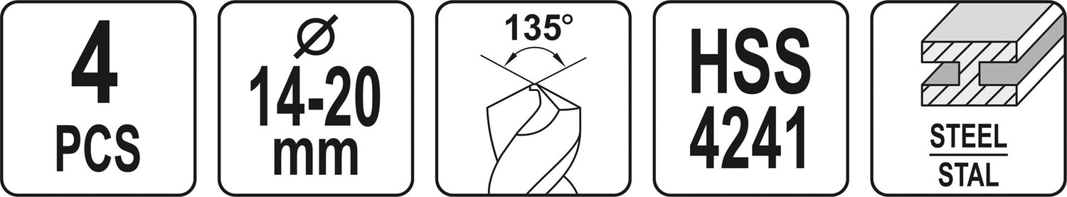 Grąžtų metalui rinkinys | 14 - 16 - 18 - 20 mm | 4 vnt. (YT-44625) yra užsakomoji prekė, ją išsiųsime per 3-4 savaites.