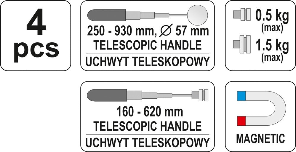 4 PCS SET, MIRROR: LENGTH: 240~920MM, DIAMETER OF MIRROR: 57MM, ADJUSTABLE IN ALL DIRECTIONS, DIPPED HANDLE, CHROME PLATED//PICK UP TOOL: HANDLE + 3 EXCHAGEABLE MAGNETIC HEADS, LENGTH: 160~520MM, HEAD DIAMETER:16MM ADJUSTABLE IN ALL DIRECTIONS, 16MM, 12MM, DIPPED HANDLE, CHROME PLATED