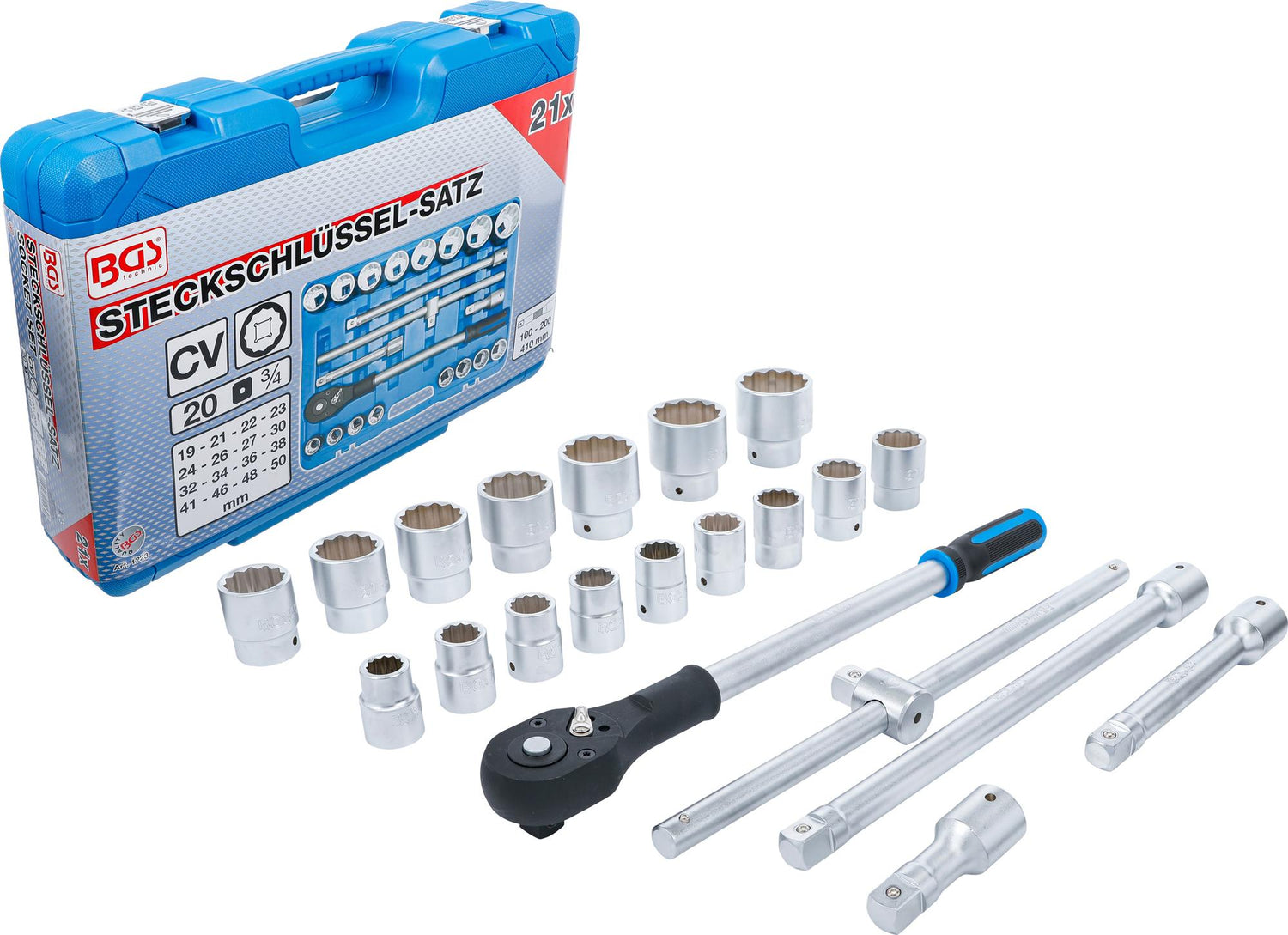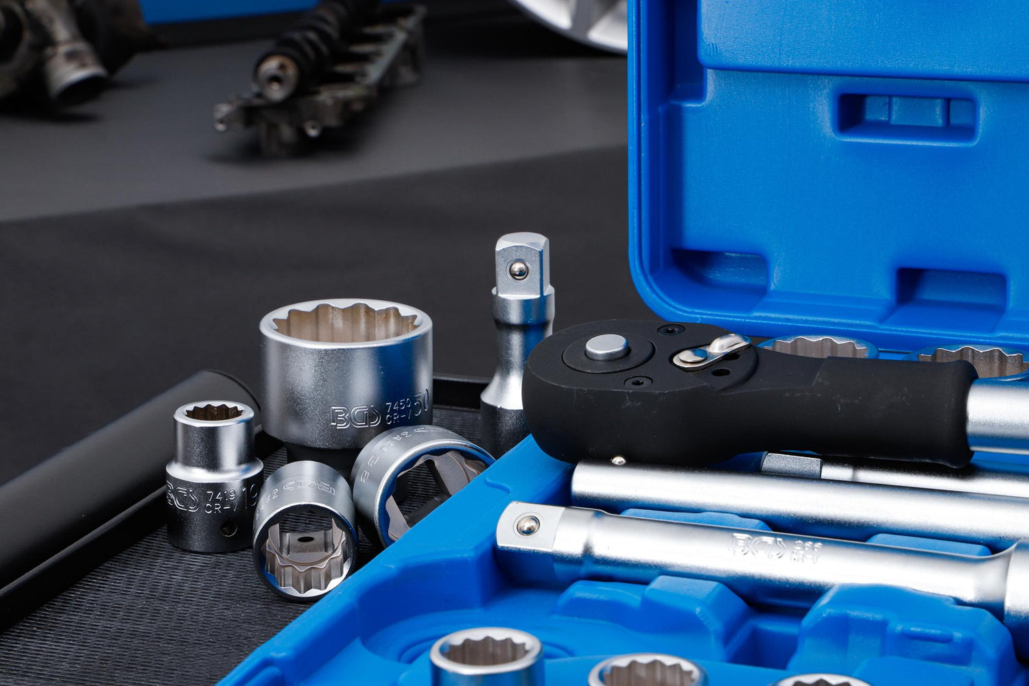 Profesionalių įrankių rinkinį BGS Technic 1223 sudaro 21 vnt. PRO+ klasės įrankių, pagamintų iš chromo vanadžio ir chromo molibdeno (CrV | CrMo) plieno lydinio. Tinka didelio intensyvumo naudojimui. Komplekte yra 3/4" dvylikakampių 12PT galvučių rinkinys, tiesaus profilio reversinis terkšlinis raktas, prailgintuvai ir T-tipo slankiojantis raktas. Įrankiai dengti matiniu chromu (Satin Chrome) ir sudėlioti tvirtame plastikiniame lagamine. Šios konfigūracijos profesionalių įrankių rinkinys tinka surinkimo darbams, automobilių remontui bei kitiems darbams namuose ar dirbtuvėse.