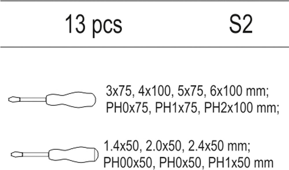 - 3 x PH tipo (kryžminiai) magnetiniai atsuktuvai: PH0x75mm | PH1x75mm | PH2x100mm | CrMo