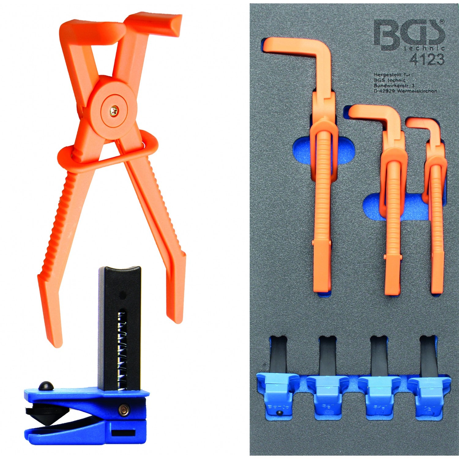 Įrankių dėkle BGS Technic 4123 sukomplektuoti šie PRO+ klasės įrankiai, skirti guminėms stabdžių, degalų, aušinimo skysčio ir pan. žarnoms fiksuoti: