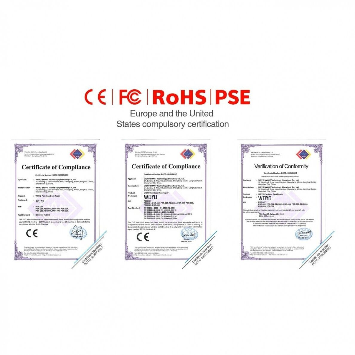 Indukcinis kaitintuvas WOYO PDR007 atitinka šiuos europinius ir JAV standartus: EN 55014-1:2006 + A1:2009+A2:2011, EN 55014-2:1997 + A1:2001+A2:2000, EN 61000-3-2:2014, EN 61000-3-3:2013, EN 61000-4-2:2009, EN 61000-4-2:2006 + A1:2008+A2:2010, EN 61000-4-4:2012, EN 61000-4-5:2014, EN 61000-4-6:2014, EN 61000-4-11:2004, FCC Part 15, Subpart B: 2014 ir ANSI C63.4:2014 bei yra pagamintas laikantis Europos Sąjungos direktyvų reikalavimų: 2011/65/EU Restriction of the Use of Certain Hazardous Substances.