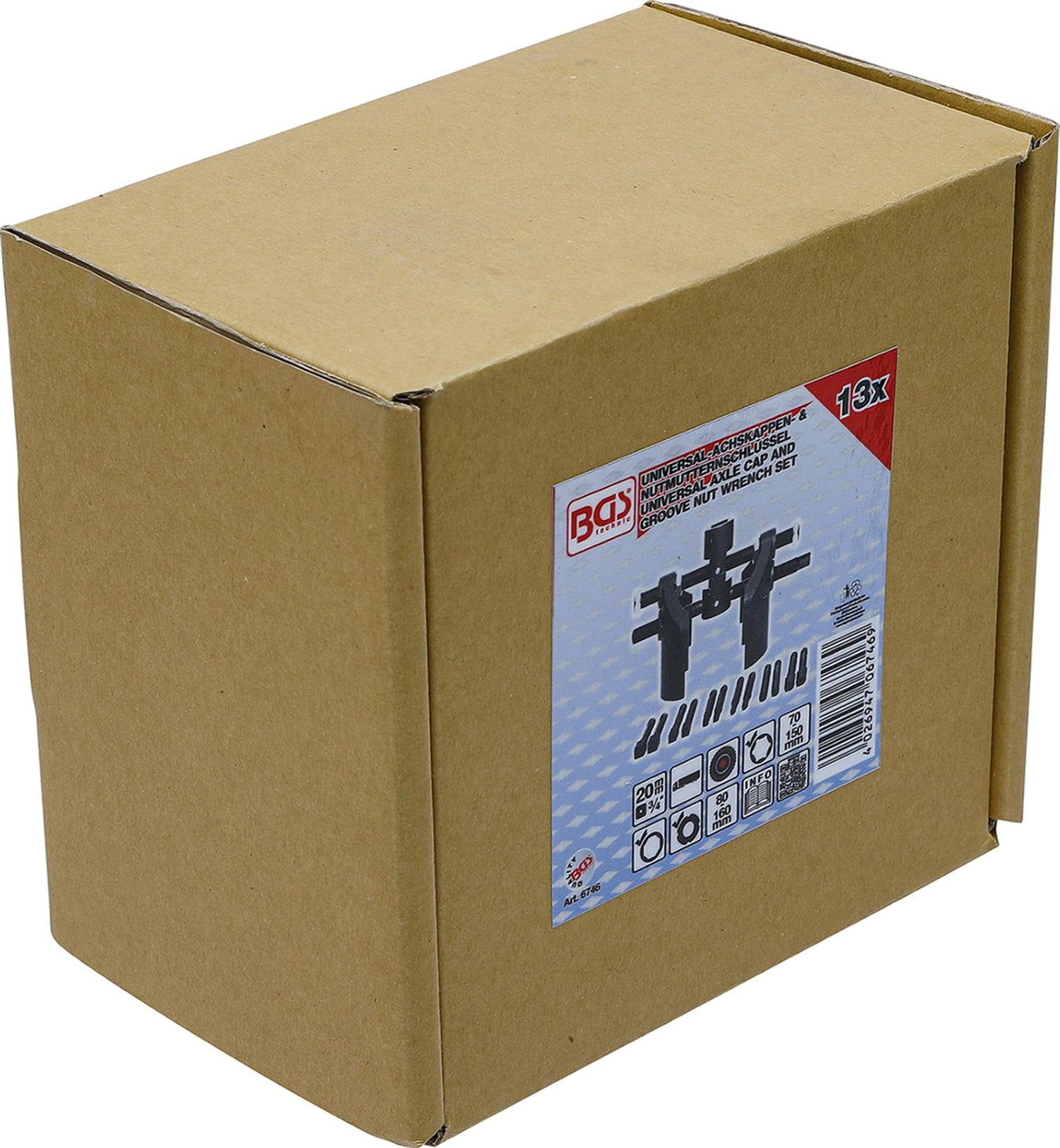 BGS technic 6746 galvutė tinka šešiakampėms HEX veržlėms nuo 70mm iki 150mm, graižtvinėms Groove tipo veržlėms su grioveliais - nuo 80mm iki 160mm.