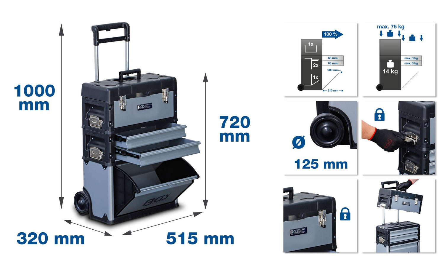 individual tool case attachments can be locked laterally by two catches and a plastic carrying handle