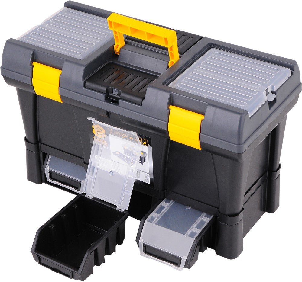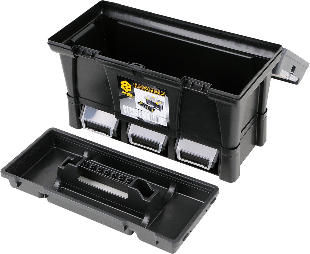 Tool box 20 "with module with 3 storage containers Dimensions 52,5x25,6x32,5 cm. The bottom tray is equipped with 3 78831 S-type storage containers with dimensions of 116x161x75 mm each. The containers are extracted and can be exchanged for containers with other equipment that may be stockpiles or tool boards. Containers are additionally equipped with 78832 covers to prevent content from dropping during handling.