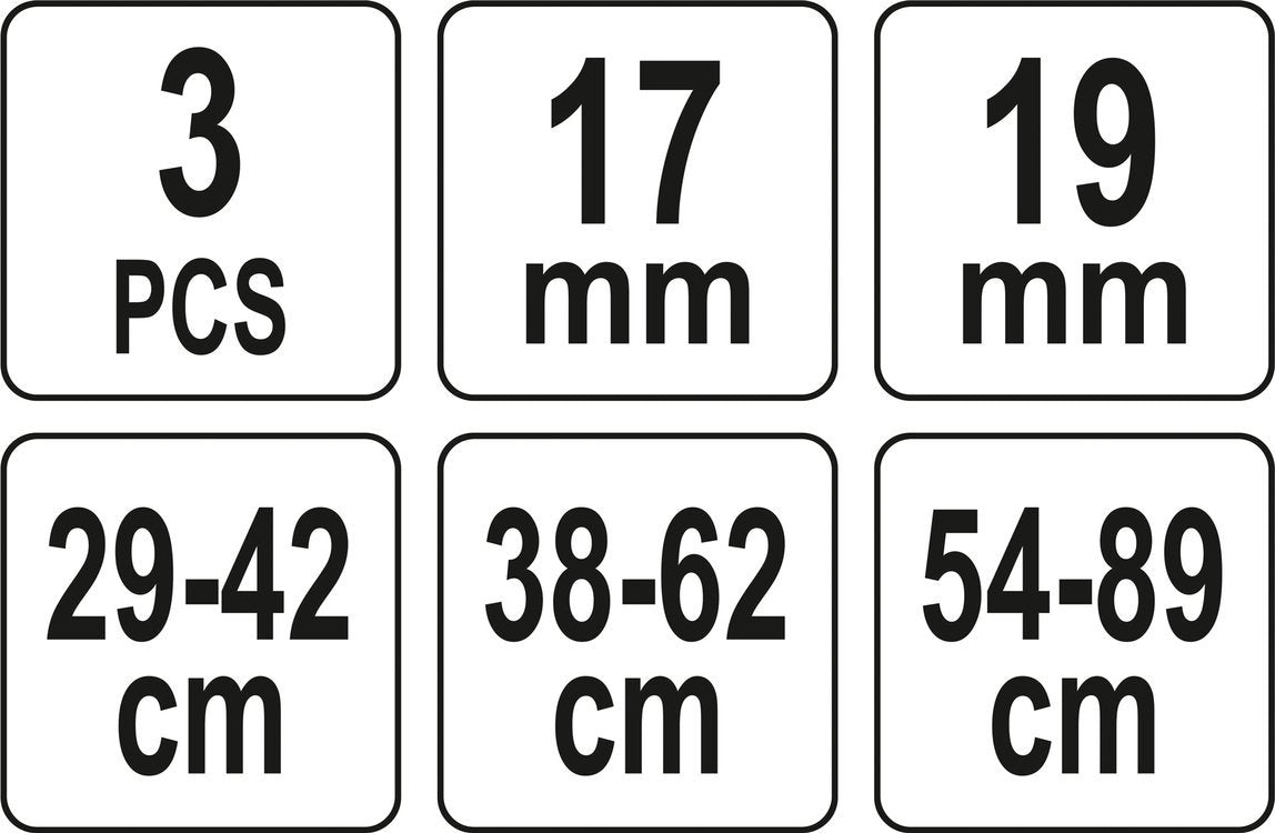 3 spreaders with a working range: 29 mm - 42 mm; 38mm - 62mm; 54mm - 89mm
