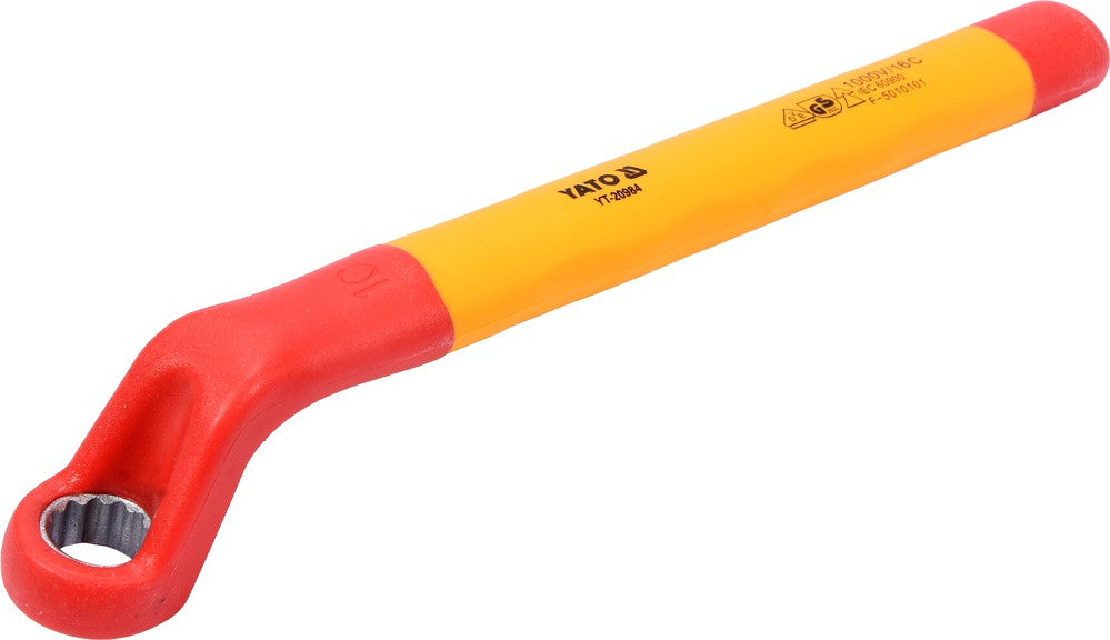 Insulated YATO YT-20984 bent eye wrench. Made of durable, chrome-vanadium steel CrV. The multi-component VDE-certified handle provides insulation up to 1000 V, making the tool suitable for low voltage installations.