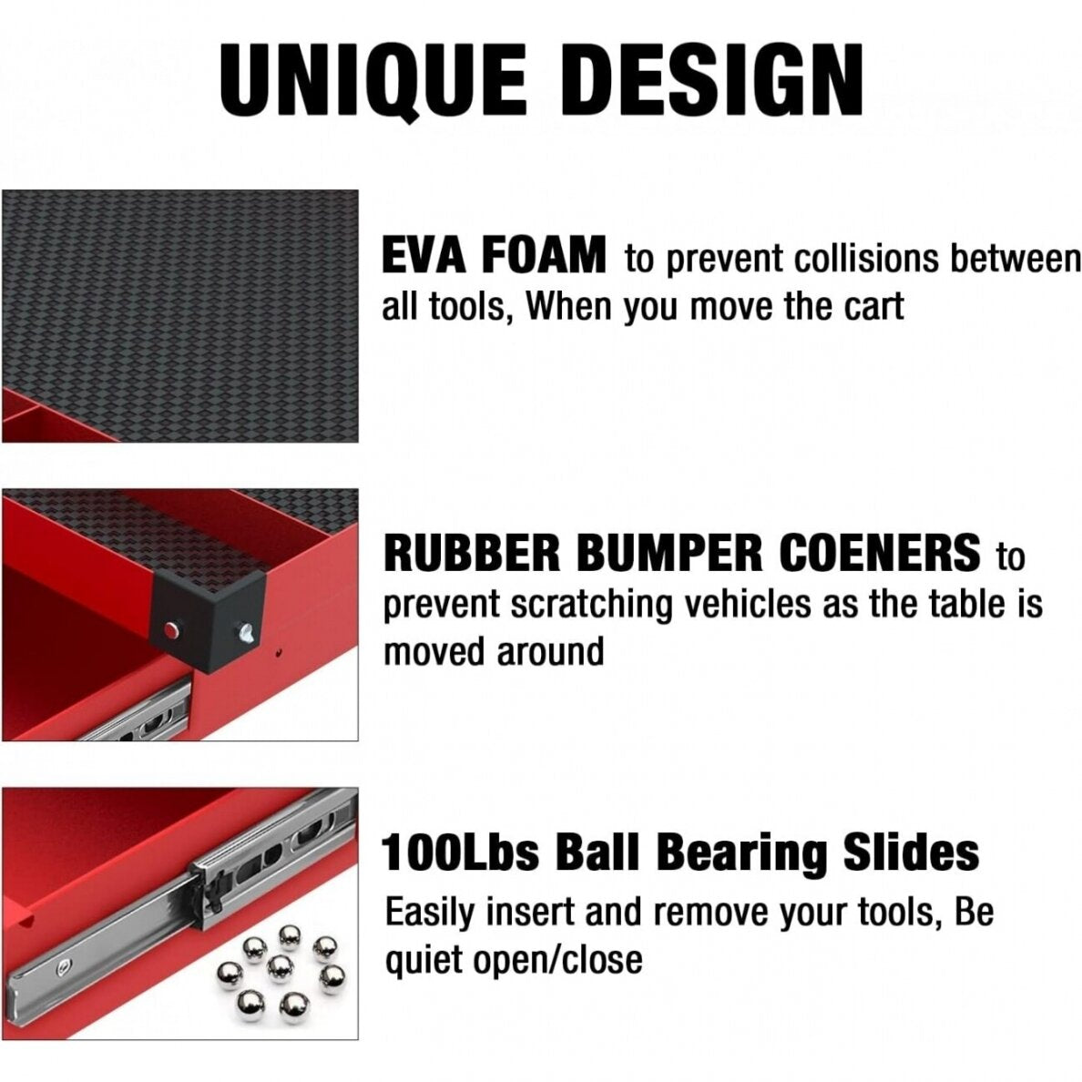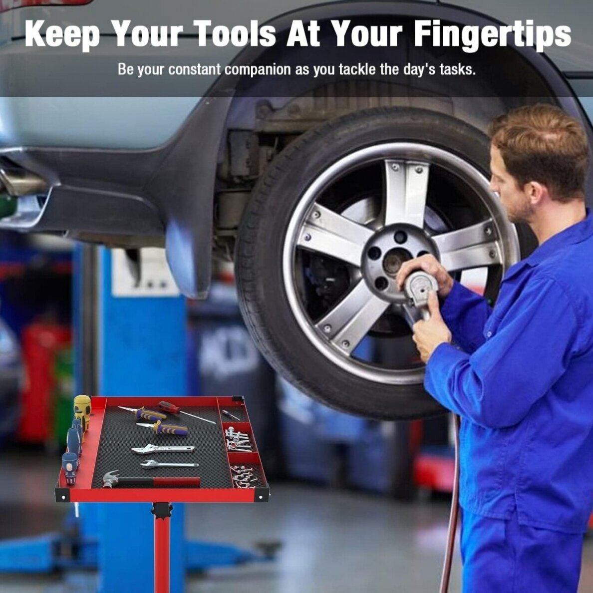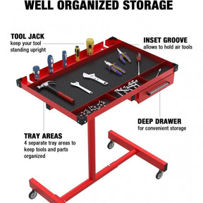 Mobilus reguliuojamas teleskopinis darbastalis dirbtuvėms WT001 - tai universalus ir tvirtas baldas, pagamintas iš legiruoto plieno, ant keturių guminių pasukamų ratukų su patogiu stalčiumi. Dažytas milteliniu būdu. Guminiai ratukai užtikrina tylų ir sklandų darbastalio judėjimą po Jūsų autioservisą ar dirbtuves; jų dėka stalą galima lengvai sukti 360 laipsnių kampu. Darbastalio dėklas pagamintas iš reljefinės neslystančios gumos, o stalčiaus dėklas - iš etileno-vinilacetato (EVA) putų. Guminės apsaugos ant staliuko kampų padeda išvengti netyčinio remontuojamos transporto priemonės kėbulo subraižymo. 45 kg apkrovą išlaikantis stalčius ant rutulinių guolių. Reguliuojamas staliuko aukštis ir pagrindo plotis. Darbastalio stalviršis suskirstytas į dvi sekcijas, kurių viena skirta didesniems, o kita - mažesniems įrankiams ar tvirtinimo detalėms. Specialios skylės atsuktuvams ar panašiems įrankiams.