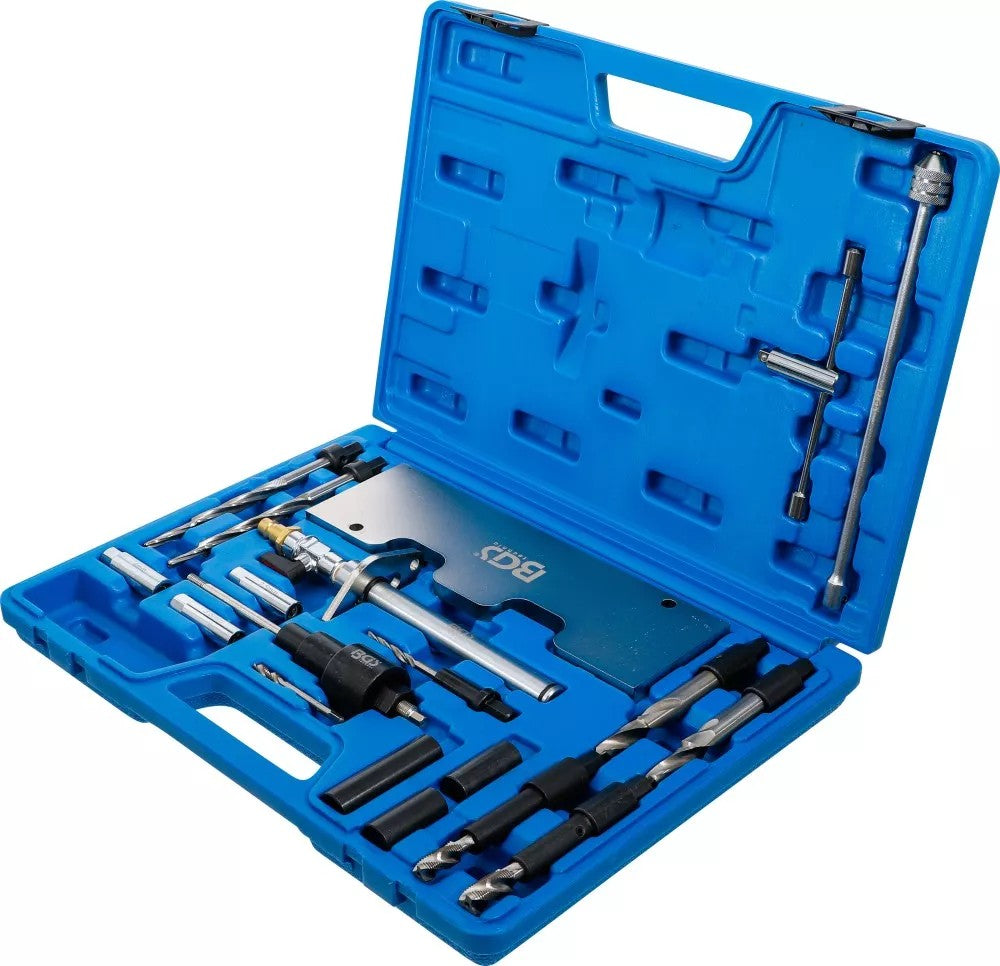 allows re-cutting or repairing of the glow plug thread and cleaning of the electrode bore. Exact depth and drilling angle are reached using guide sleeves