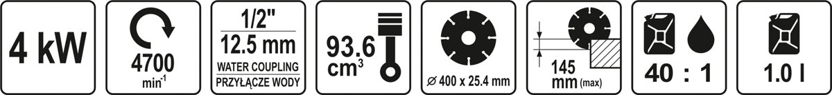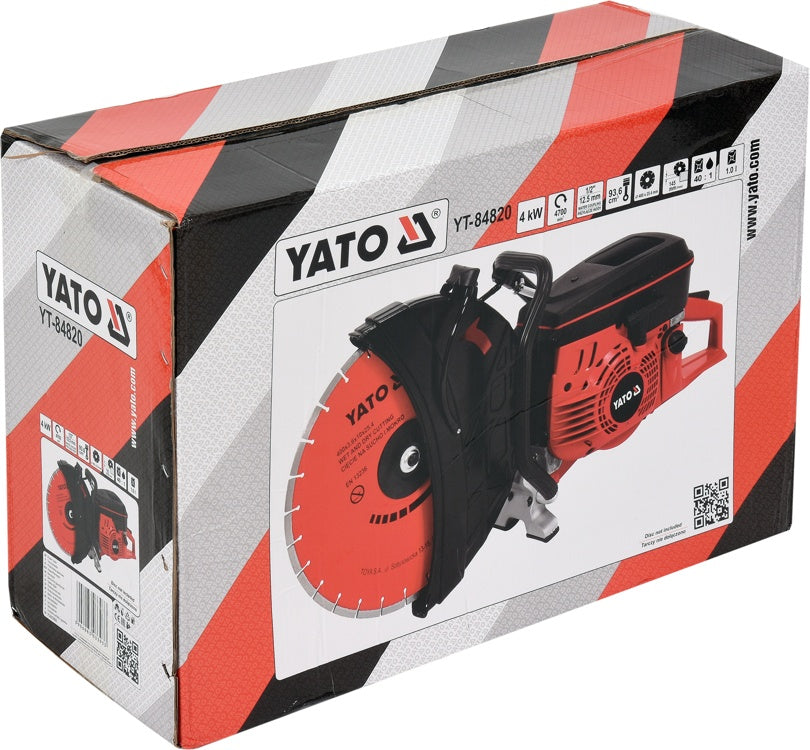 Benzininė betono pjaustyklė YATO YT-84820 - tai galingas žemos vibracijos PRO klasės pjovimo įrankis su standartine 25.4mm jungtimi, skirtas sauso ar šlapio pjovimo būdu deimantinių diskų pagalba pjaustyti plieną, betoną, gelžbetonį ir kitas keramines medžiagas: įrankis puikiai tinka durų ir langų angų išpjovimo ar padidinimo darbams, laiptų pakopų korekcijai, darbams su sienomis, keraminių ir silikatinių blokų bei pamatų blokų pjaustymui, montavimo kanalų, skirtų šildymo, vėdinimo ir oro kondicionavimo (ŠVOK) sistemų įrengimui, išpjovimui sienose, betoninių konstrukcijų griovimo darbams, lauko akmenų, smiltainių ar granito pjaustymui ir kitiems panašiems darbams.