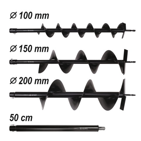 The set includes: 100 mm, 150 mm, 200 mm drill bits and a 50 cm drill extension.