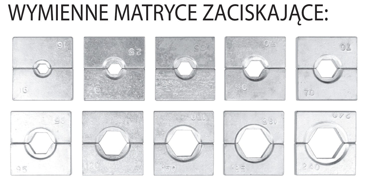 SIZE: 16-240M2; CRIMPING RANGE: ALUMINIUM TERMINAL- 16-185MM2, COPPER TERMINALS- 16-240MM2; WORKING PRESSURE: 12T; DIE CONFIGURATION: 16, 25, 35, 50, 70, 95, 120, 150, 185, 240MM2; USE 32# MECHANICAL OIL; HRC 15