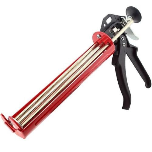 Squeezer for dense masses. Lightweight, made of sheet steel, varnished. Comfortable, profiled, ergonomic handle made of aluminum, allows for effective application of dense masses, eg adhesives, sealants, lubricants, etc. of substances from typical 300 ml containers. Strengthened design / double piston / increases the pressure and application efficiency, especially important when extruding thick, sticky substances or when working in low temperatures / hardening masses are difficult to squeeze and often cause the destruction of weak squeezers /.
