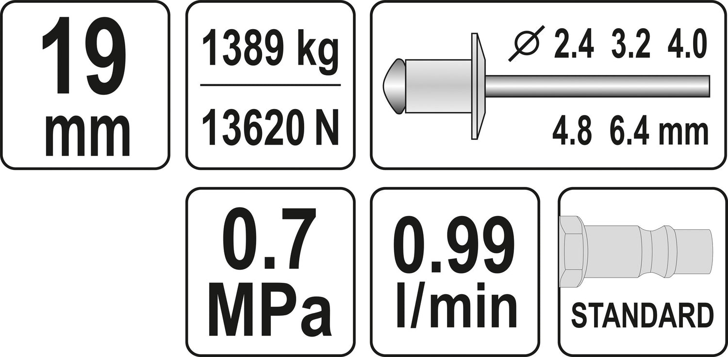 Diameter of supported rivets [mm] - 2.4; 3.2; 4.0; 4.8; 6.4