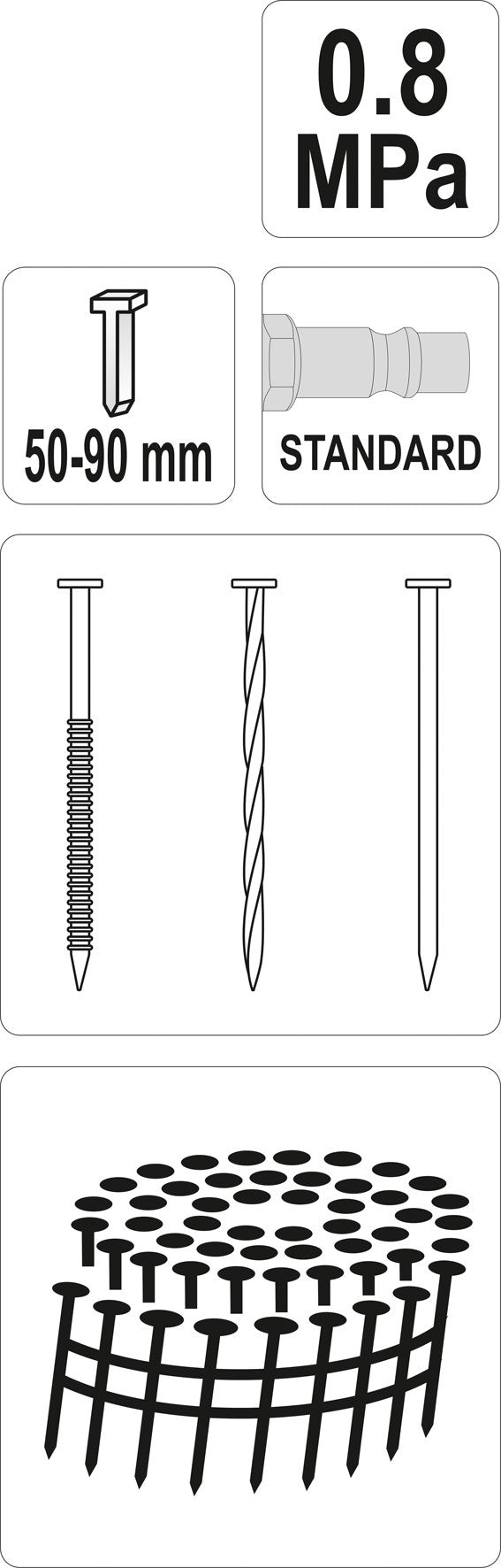 LENGTH OF NAILS: 50-90MM; DIAM. OF NAIL: 2,5- 3,3MM; OPERATING PRESSURE: 75-110PSI (5-7,5KG/CM2); WEIGHT: 3,9KG; DIMENSIONS: 376x145x375MM; LOAD CAPACITY: 300; 360 DEGREES EXHAUST DIRECTION; GERMAN TYPE CONNECTION- 1/4 BSP; "CONTACT MODE" SAFETY SYSTEM; LIGHT DIE CAST BODY OF MAGNESIUM ALLOY; USES 15 DEGREES WIRE COLLATED COIL NAILS; SIDE LOADING SYSTEM; EQUIPPED WITH DUST COVER AND BODY PROTECTOR