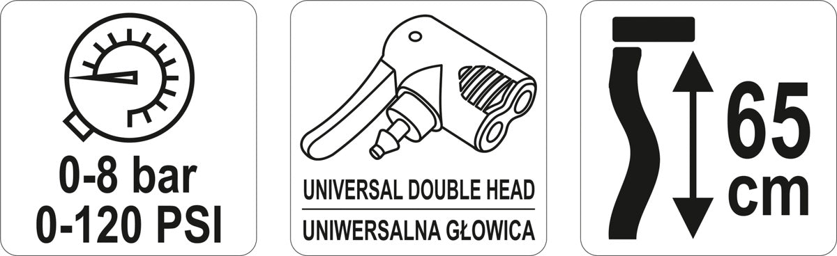 Manual pole pump with a maximum pressure of 8 bar. It has a universal head for inflating car and bicycle valves.