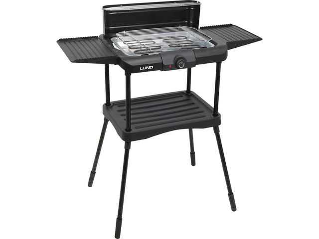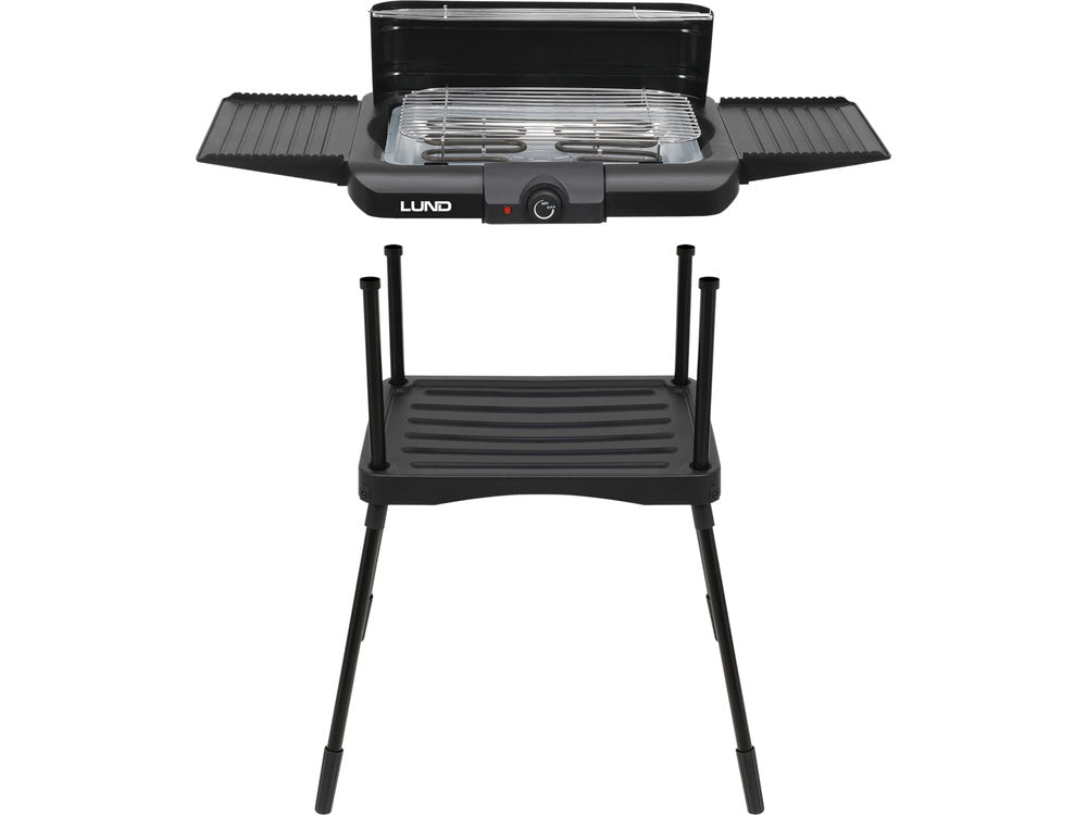 LUND electric grill designed for preparing meat, fish and vegetables. Equipped with a chrome-plated grid and warming grid. The lower shelf and two side shelves provide additional space for accessories, spices and drinks. The water bowl prevents grilling from generating smoke. The stainless steel heating tube ensures fast heating and even heat distribution. The higher edge makes it easier to keep the area around the grill clean.