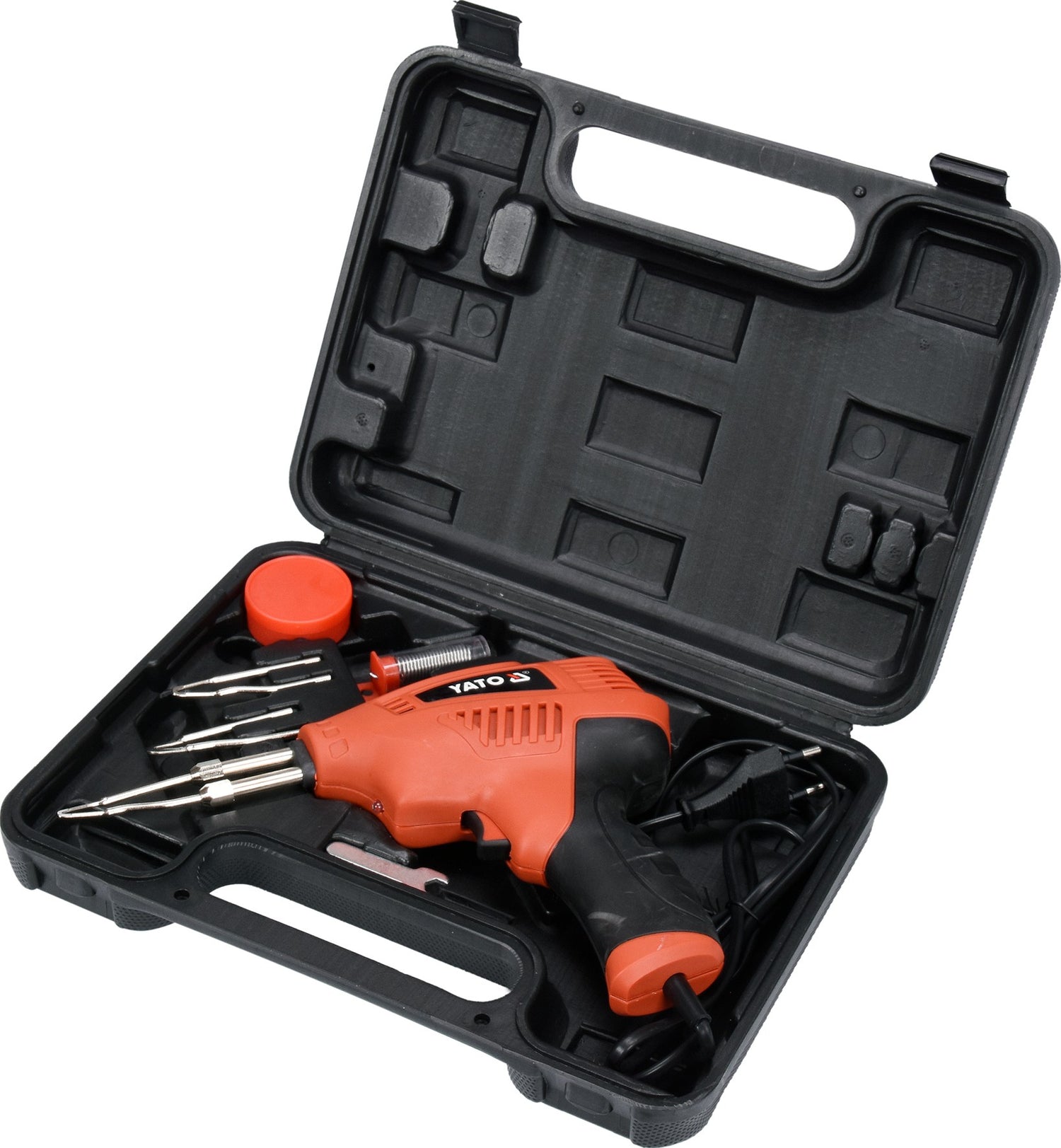 Gaminys sukomplektuotas su 3 keičiamais antgaliais, kanifolija, alavo lydmetaliu ir pateikiamas tvirtame YATO lagamine.
