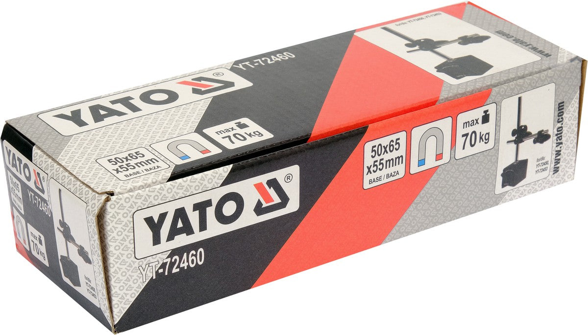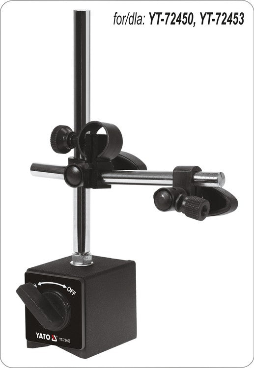 Professional magnetic stand YT-72460 for dial gauges YT-72450 and YT-72453. It has an elastic joint for precise positioning of the dial gauge on the measured element. Central locking of the center and top joint with a knob. Magnetic base with a prismatic groove on the bottom. The high pulling force ensures a stable and secure connection with metal elements - the element is unfastened with a special knob.