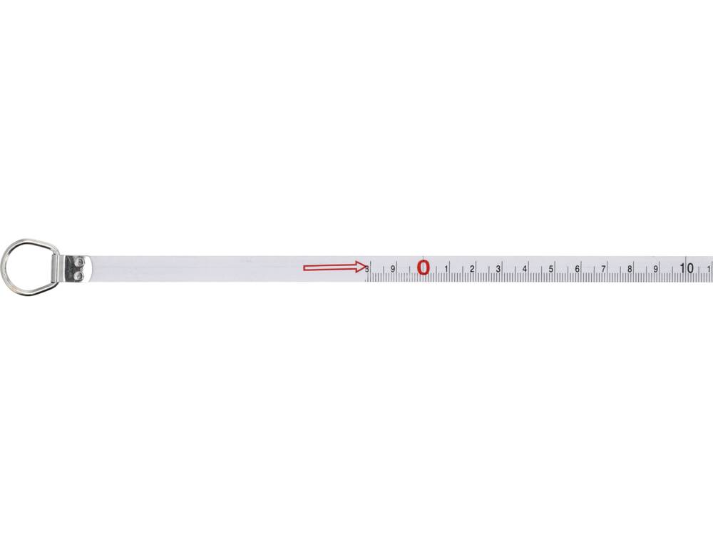 A steel tape, 20 m long and 10 mm wide, with a crank for winding and a sharp point for setting the measurement in the ground.