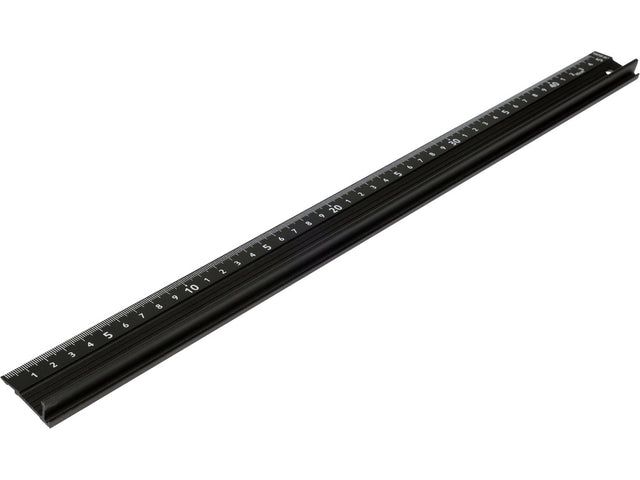 Aluminum ruler with a profile in the upper part that serves as a safe handle to hold the ruler while cutting. The bottom surface is glued with a strip of foam that protects the material being measured. For convenience of use, the ruler has a hanging hole.