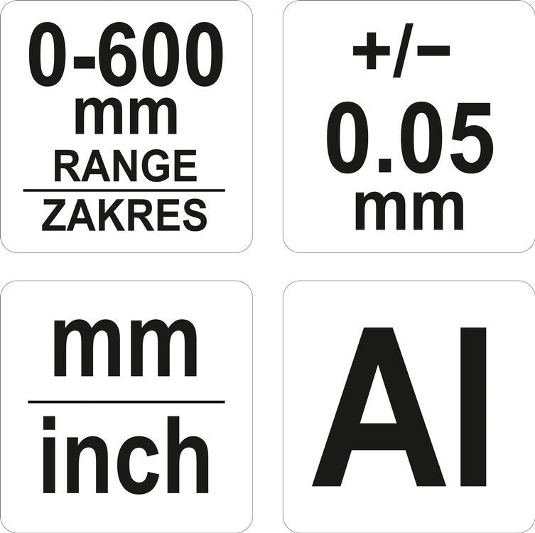Caliper designed for precise measurements in the range of 0-600 mm. Used in works, mechanical, construction, automotive