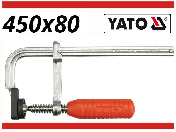 Carpentry clamp, forged 450x80 mm, YATO brand. Advantages: - Quick adjustment - The clamp is forged from one piece of steel. - Pressure screw with trapezoidal thread