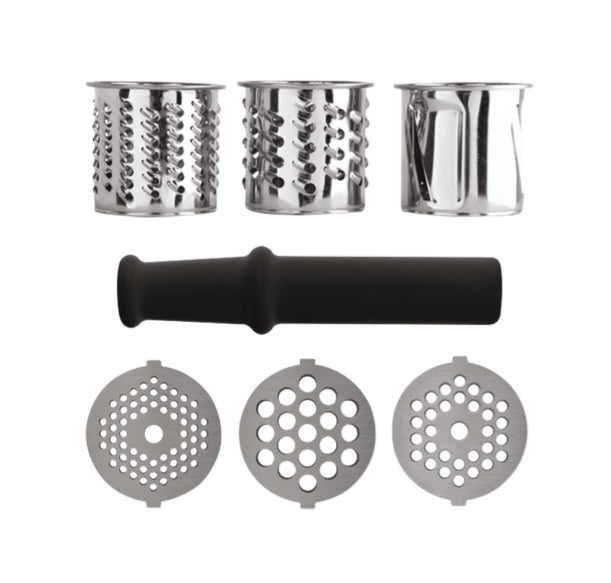 meat grinder|tray|blade|grating and shredding insert x3|grinding disc x3 (diameter 3mm, 5mm, 7mm)|sausage filling attachment|kebbe attachment x2|d squeezer