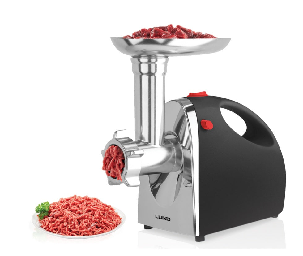 Multifunctional LUND 5in1 meat grinder with a peak power of 1200W and a capacity of 1.5kg/min. It is equipped with high-quality stainless steel blades and a metal tray and 3 sieves with different hole diameters. It allows you to mince meat of various thicknesses, chop vegetables, squeeze juice, fill sausages and prepare kebbe.