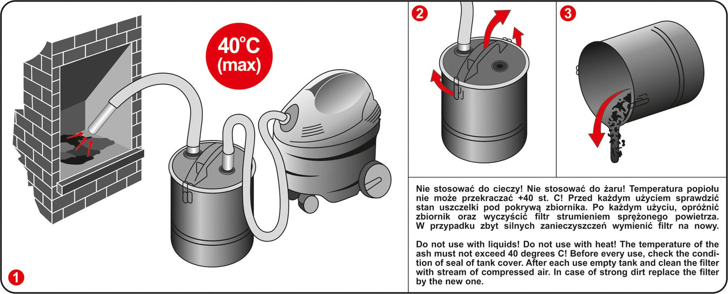 Very good quality filtering device, Vorel ash separator. After connecting it to the vacuum cleaner, it serves as a filter to stop the impurities remaining in the furnace. Ideal for cleaning the fireplace. It is equipped with a PET filter mounted in a plastic basket. The metal tank with a capacity of 18l can be quickly cleaned thanks to the use of 2 clamps. The kit also includes a flexible hose with a length of 1 m made of galvanized steel. It is finished with an aluminum end with a length of 23cm and a diameter of 38mm. The possibility of connecting a vacuum cleaner equipped with a hose with a diameter of max 34mm.