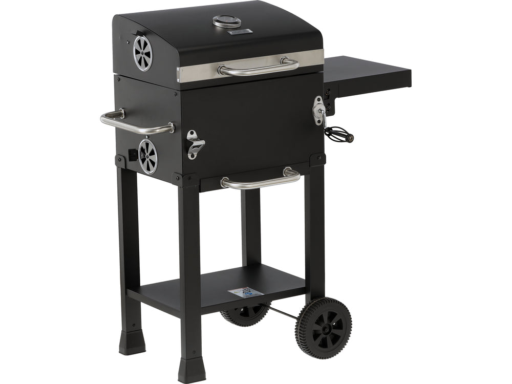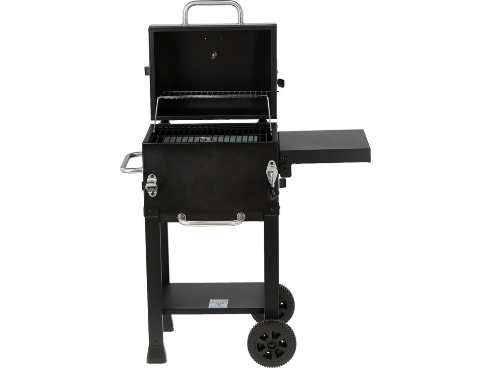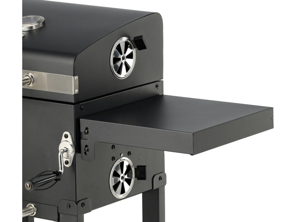 Practical shelves and handles - a folding side shelf serves as a worktop, and the lower shelf can hold charcoal, dishes, or grill accessories. Steel handles allow you to conveniently hang tongs or a spatula and operate the grill.