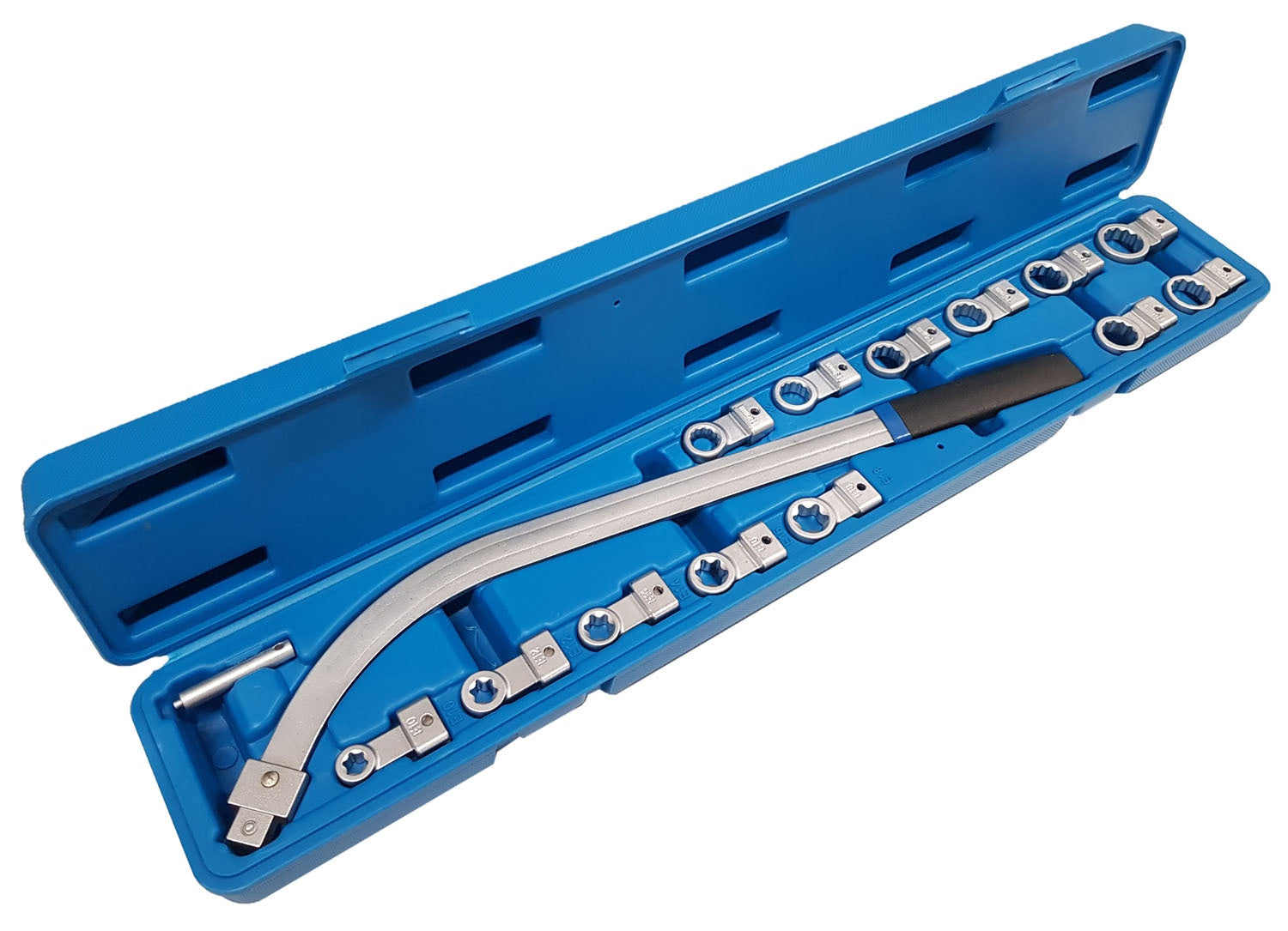 This pulley wrench set has a long curved handle to make access easy and comes with 13 interchangeable adaptors suitable for almost all types of vehicles.