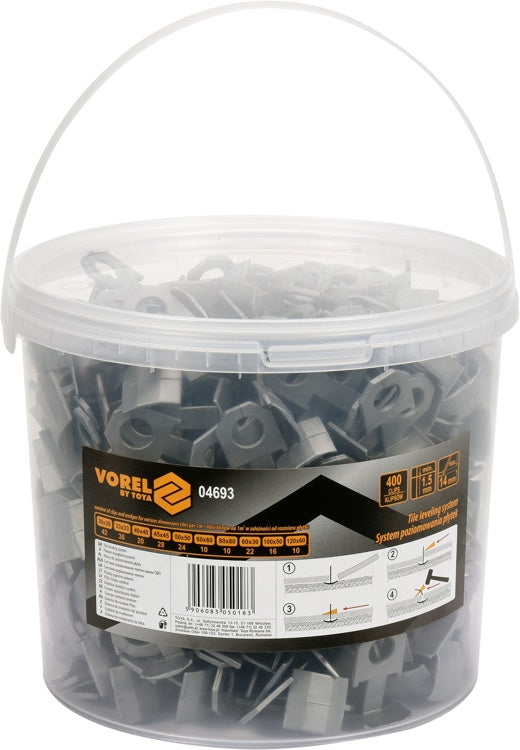 Clips for the leveling system of tiles, which very quickly and easily help to arrange perfectly tiles saving time and eliminating the inaccuracy of the surface. It consists of a set of 400 breakable clips made of high quality plastic. Perfect for professionals and amateurs.