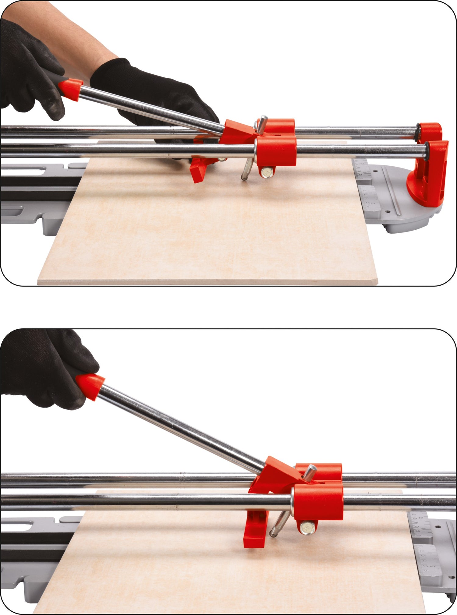 Die-cast aluminum base with two movable supports mounted to support large tiles. The ball-bearing breaker unit is mounted on stable steel guides made of 16 mm diameter tubes. Cutting knife - disc diameter 8 mm - permanently mounted on a pin diameter 10 x 82 mm. Two strips of technical micro-rubber are glued to the worktop, making it easier to break the tiles. The breaker lever is steel, diameter 15 mm, and also serves as a knife lock.