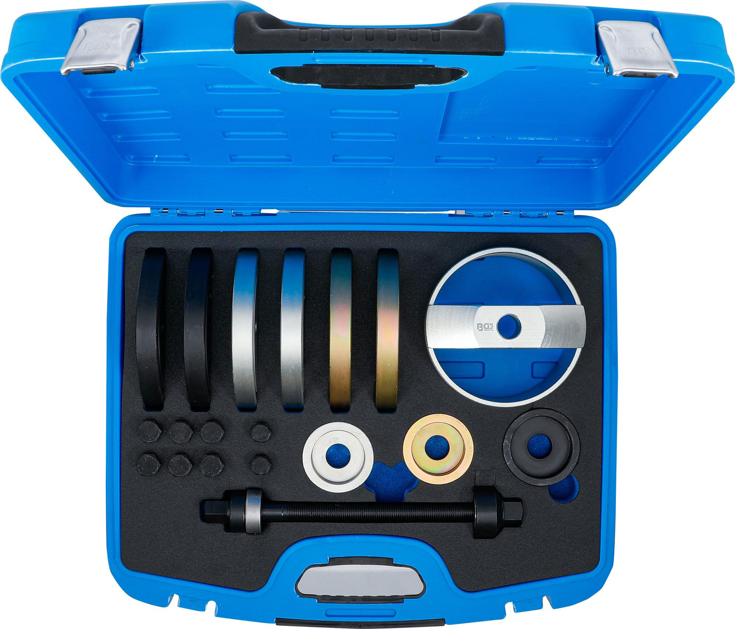 PRO+ klasės ratų guolių stebulės montavimo įrankių rinkinys BGS Technic 6250 skirtas GEN2 (antrosios kartos) guolių montavimui ir demontavimui. Komplektas leidžia greitai ir saugiai sumontuoti GEN2 guolius tiesiogiai ant automobilio, nenuimant važiuoklės detalių. Specializuoti įrankiai supaprastina giliai įmontuotų guolių išėmimą, sumažinant riziką sugadinti važiuoklės dalis bei sutaupo daug darbo laiko.