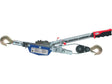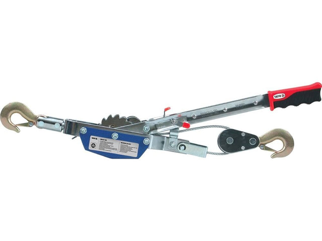 The manually driven rope winch consists of a steel body containing a drum, gears and a ratchet mechanism with a large, appropriately selected gear ratio. The driving lever is used to move the drum and wind the steel rope. The winch can move loads weighing up to approx. 1020 kg over a distance of approx. 3 m. A rope winch with a manual drive is used to transport loads in a horizontal plane, e.g. to drag boxes along a ramp. Due to its construction, it cannot be used for vertical lifting of weights.