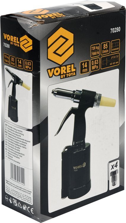 BLIND RIVET SETTING CAPACITY: 3/16", 5/32", 1/8", 3/32" [2,4/ 3,2/ 4,0/ 4,8MM] TRACTION POWER: 1.586LBS/ 720KG, STROKE LENGTH: 9/16"/ 14MM, AIR INLET: (PT): 1/4", AIR HOSE (ID): 3/8", AIR CONSUMPTION: 3CFM
