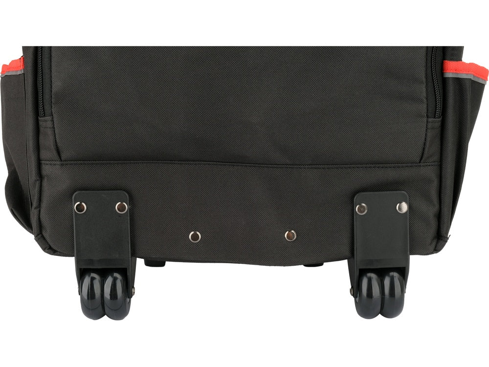 At the base, two wheels and a telescopic, retractable handle in the upper part were used, allowing for quick transformation of the backpack into a convenient transport suitcase. This solution relieves the spine when carrying a heavier set of tools. Wide, adjustable shoulder straps ensure comfort when carrying in a traditional way, evenly distributing the weight even when fully loaded.