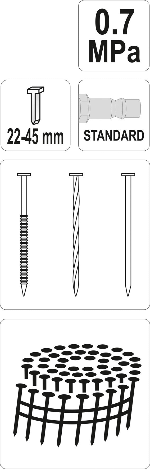 LENGTH OF NAILS: 22-45MM; DIAM. OF NAIL: 3,05MM; OPERATING PRESSURE: 75- 110 PSI (5-7,5KG/CM2); WEIGHT: 2.60KG; DIMENSIONS: 250x117x264MM; LOAD CAPACITY: 120; GERMAN TYPE CONNECTION-1/4 BSP; "CONTACT MODE" SAFETY SYSTEM; LIGHT DIE CAST BODY OF ALUMINIUM ALLOY; USES 15 DEGREES WIRE COLLATED COIL NAILS; SIDE LOADING SYSTEM; EQUIPPED WITH DUST COVER AND BODY PROTECTOR