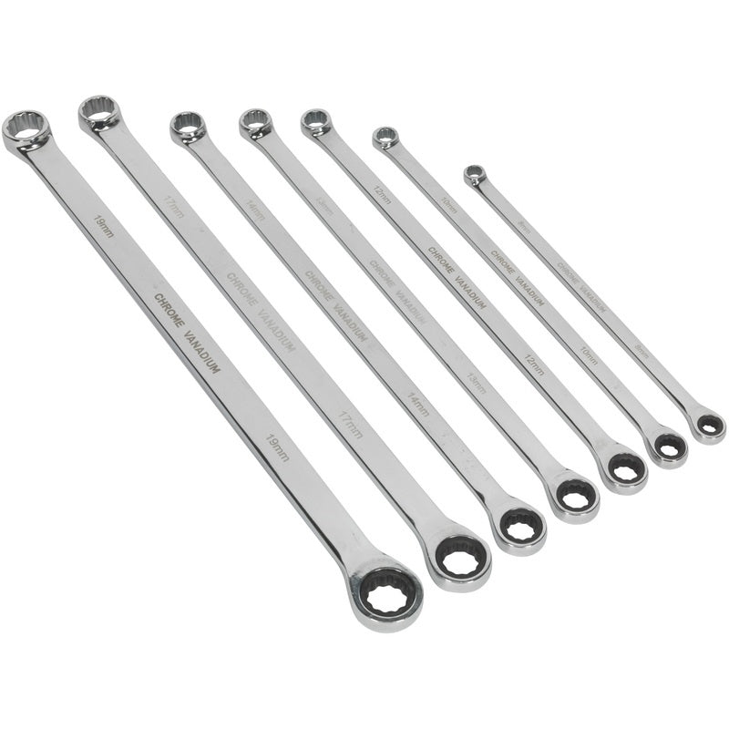 Dvigubo žiedo raktų rinkinys su terkšle | ilgas tipas | 8 - 19 mm | 7 vnt. (DR07)