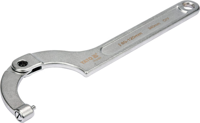Hook wrench with round pin, articulated brand YATO YT-01678. Made of durable chromium-vanadium steel CrV. Matt, chrome-plated key surface finish. Designed to service flanges, rings, and bearings.