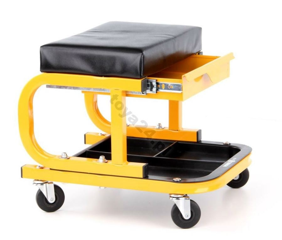 Workshop mobile stool for mechanics. Smooth operation guarantees four wheels with a diameter of 2 ". Frame made of steel profile, seat covered with easy to clean vinyl. Under the seat is a tool drawer and small parts located on the guide rails. Load capacity about 90 kg.