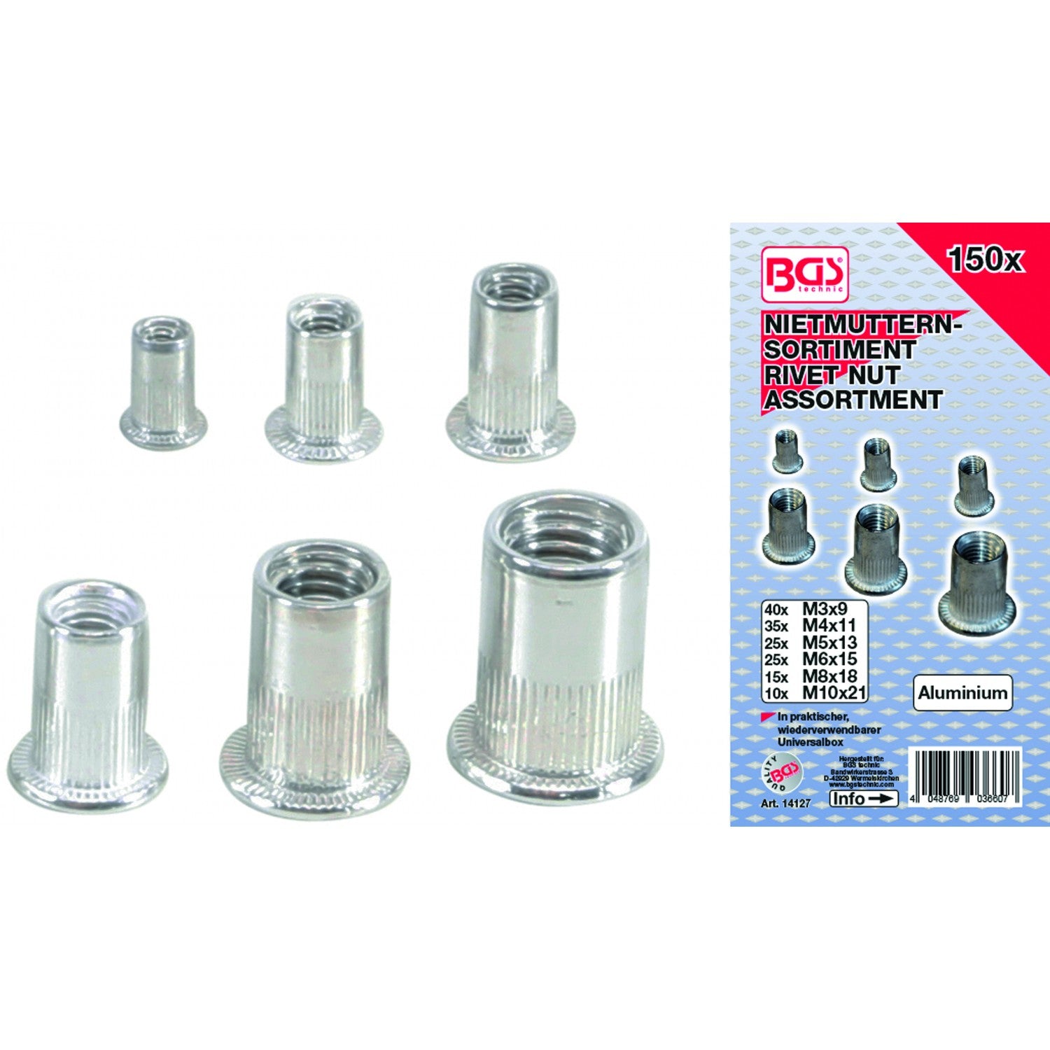 Srieginių kniedžių galvučių asortimentas | aliuminis | 150 vnt. (14127) yra užsakomoji prekė, ją išsiųsime per 3-4 savaites.