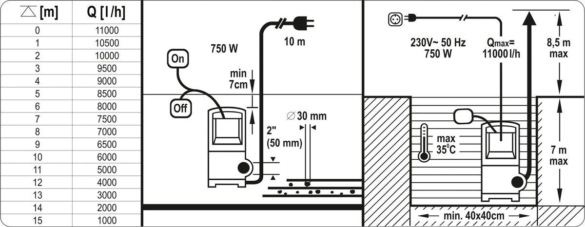 the automatic float switch on the side guide reacts to the changing water level from just 5 mm - the pump switches on automatically, ensuring that all water is pumped out without having to supervise its operation