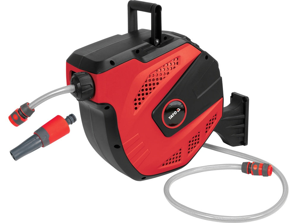 Water hose on an automatic rewinder in a resistant housing. Thanks to the "auto stop" mechanism, the hose is wound evenly. The holder allows the reel to be mounted to the wall. The hose is resistant to UV radiation.
