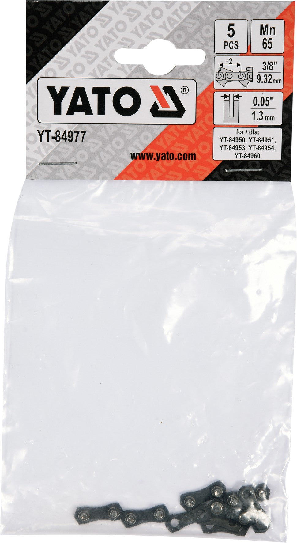 MATERIAL: 65MN; SIZE: 3/8" / 0,05"; INCLUDING: OUTER PLATE AND CONNECTION LINK- 5PCS IN SET; FOR CHAINS: YT-84950 / YT-84951 / YT-84953 / YT-84954 / YT-84960