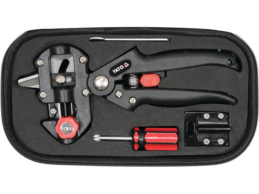 Secateurs for grafting trees, shrubs and vines and for making precise cuts. The high-quality blade allows for a smooth cutting surface. The blade locking mechanism guarantees safety during operation. The ergonomic handle ensures comfort of use. The pruning shears with accessories are placed in a durable case.