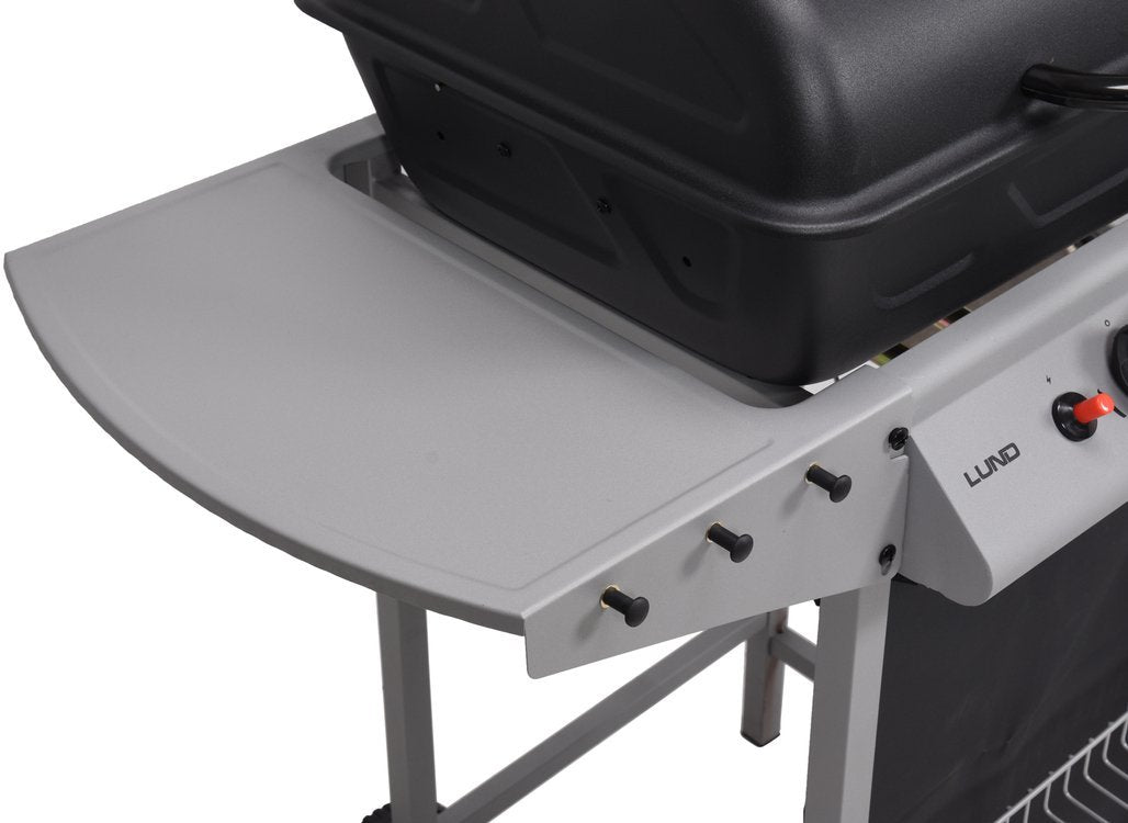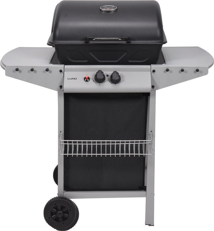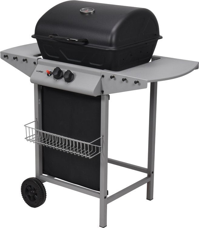 Functional and compact gas grill with 2 burners for preparing food in the open air